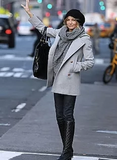 Cameron si vybrala monotónní kombinaci šedé a černé. Kratší vlněný kabátek doplnila mohutnou pletenou šálou jen o pár odstínů tmavší a jednoduchými úzkými džínami v barvě neopíraného denimu. Štíhlý střih kalhot velmi pěkně kontrastuje s těžším materiálem kabátu. Celou siluetu propojila černými doplňky – vysoké kozačky s decentním prošíváním ve stylu Chanel, velká kabela do ruky a perfektní pletený baret.