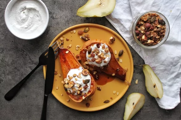 Když jsem plánovala tento recept, chtěla jsem, aby to bylo nějaké sezonní jídlo. Hrušky jsou skvělou potravinou, jelikož se dají přes zimu skladovat až do další sezony. Přidala jsem k nim voňavou skořici, která krásně prohřeje tělo a působí antibakteriálně proti všem bacilům. Díky sirupu hrušky krásně zkaramelizují a tečkou je už jenom jemná kokosová šlehačka a křupavá granola.