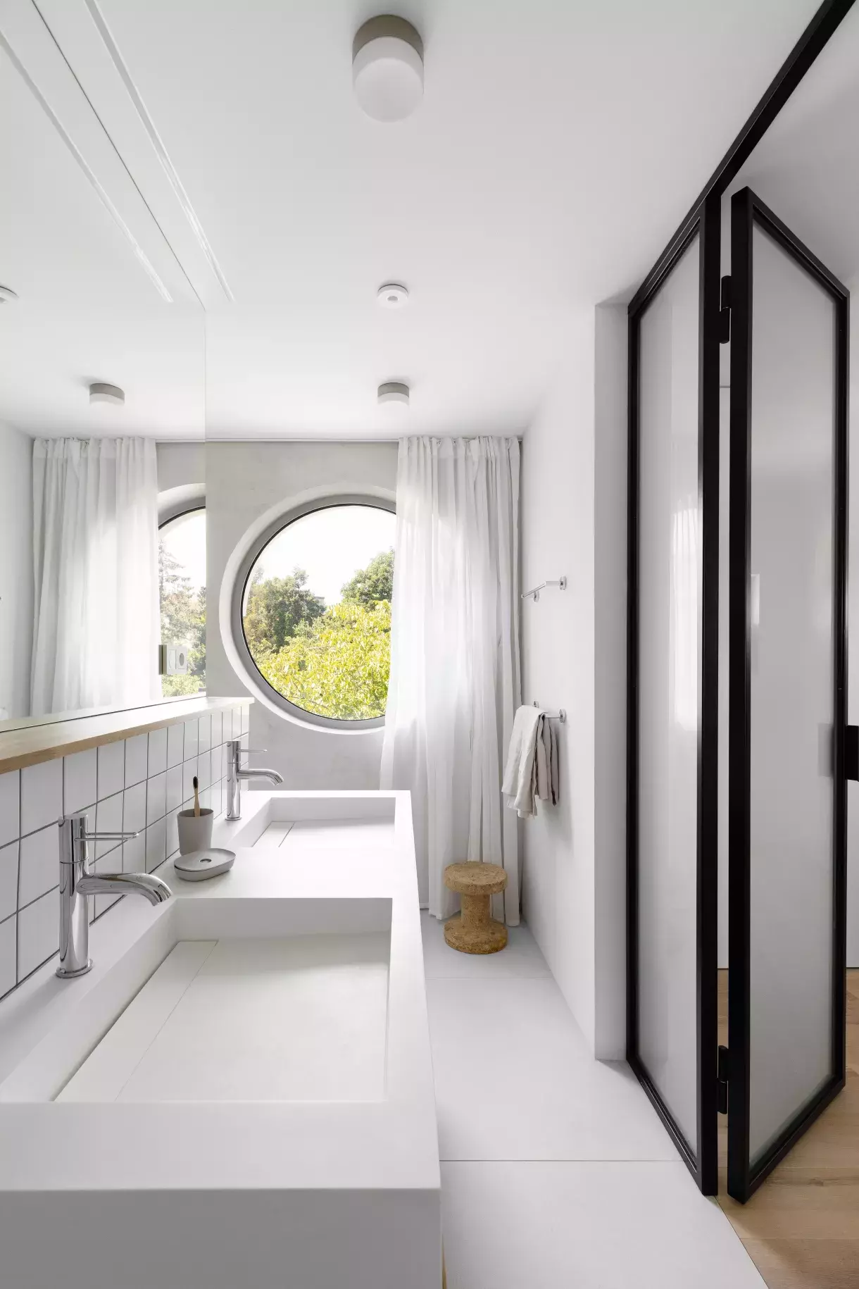 V domě byste našli koupelny celkem čtyři. Každá sice vypráví trochu jiný příběh, ale zároveň se krásně doplňují díky jednotícím prvkům, jako jsou jednoduché bílé dlaždičky nebo velkoformátová dlažba na podlaze.