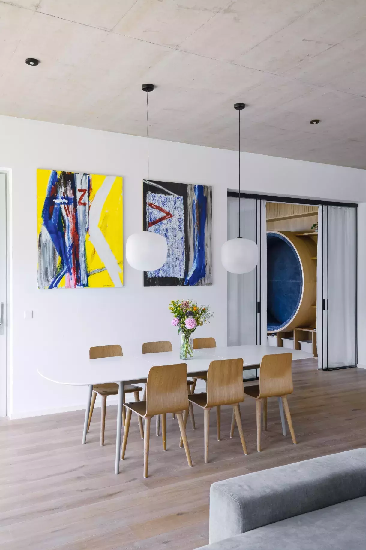 Třebaže se při realizaci interiéru často nabízejí cenově příznivější alternativy, je dobré dát na zkušeného architekta. V případě spolupráce majitelů s Martinou Šandovou to byla například umělecká díla od Michaely Červené, Richarda Konvičky (zde na fotografii jídelny) nebo Davida Krňanského.