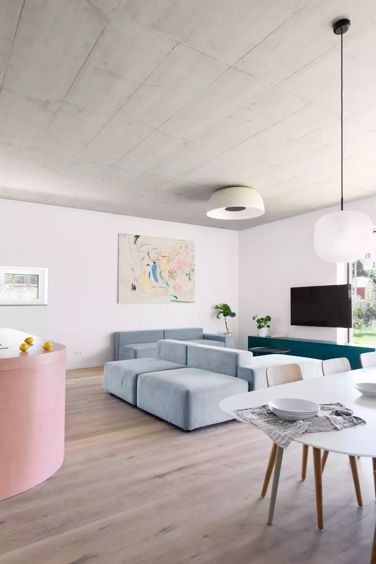 Odhalený betonový strop dává podle Martiny prostoru úplně jiný, pro mnohé možná překvapivě útulnější charakter, než projektanti zamýšleli. Ti původně navrhli podhledy. „To mi ale přišlo jako velká škoda, vůbec mi tam neseděly,“ hodnotí architektka.