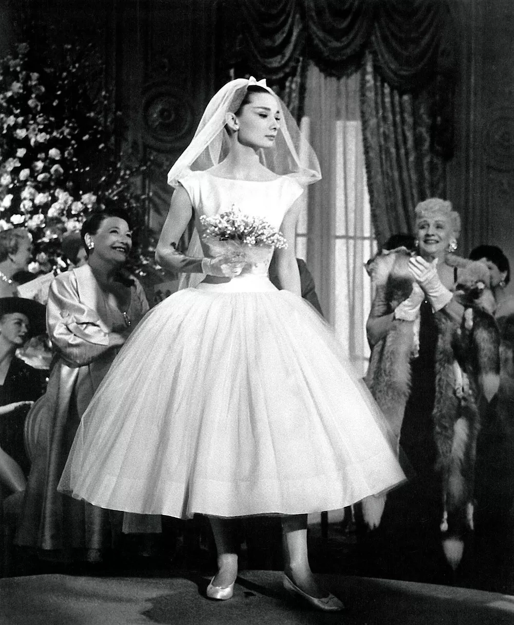 Že svatební šaty musí být jen dlouhé? To rozhodně ne. Nádhernou svatební róbu Jo Stockton (Audrey Hepburn) má na svědomí módní návrhář Hubert de Givenchy a právoplatně herečku povýšil na první příčky v žebříčku nejkrásnějších nevěst.