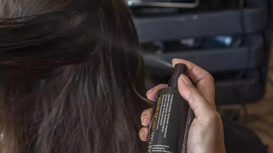 V prvním kroce kadeřníci použili Texture Maker od Sebastian Professional pro texturu a fixaci. Tento sprej je trochu slaný, takže vytvoří lehce drsnější texturu vlasů, se kterými se pak dále lépe pracuje.