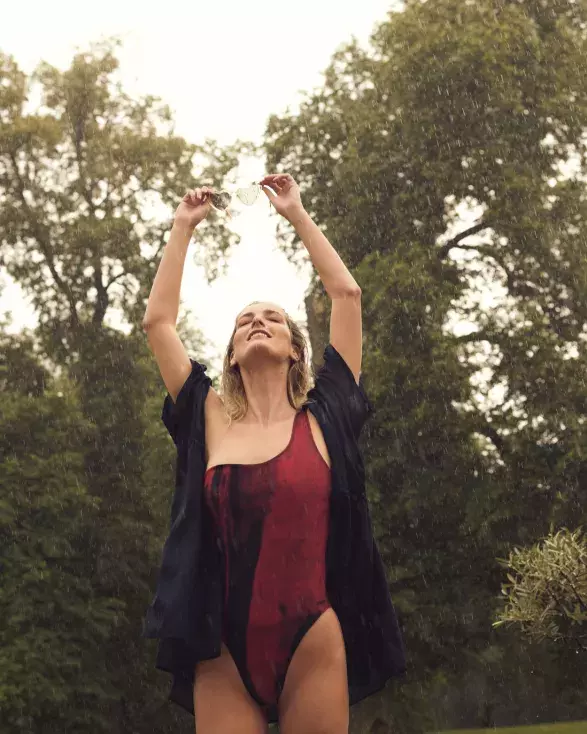 K bazénu, na pláž, na opalování na zahradě a nebo… Na bezstarostné běhání v letním dešti! Potřebujete být nutně u moře, abyste mohla obléct jednodílné plavky v asymetrickém střihu? Určitě ne, stačí na ně mít zrovna náladu a vzít je třeba i namísto topu k džínovým kraťasům nebo černé sukni. K barevné kombinaci sytě červené a černé se skvěle hodí lehký černý přehoz, který je základním kouskem letního šatníku.