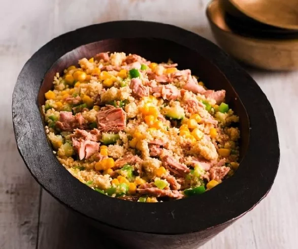 Do 125 ml vroucí vody vmíchejte 65 g kuskusu, nechte 5 minut zakryté stát. Kuskus načechrejte, dejte stranou. 60 ml červeného vinného octa, 2 lžíce olivového oleje, lžíci dijonské hořčice, ¼ lžičky soli a cukru a po špetce pepře a česnekového prášku prošlehejte v míse. Vsypte kuskus; 2 zelené papriky, očištěné, salátovou okurku, bez semen, a cibuli, vše nasekané; 50 g velkých rozinek; 170g konzervu tuňáka a 400g konzervu kukuřice, slité. Zamíchejte, nechte zakryté hodinu v chladu.