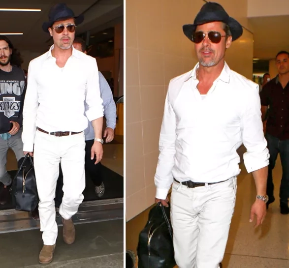 Bílé džíny, bílá košile, pilotky, černý klobouk, semišové boots a stříbrné rolexky. Brad by mohl okamžitě dělat stylistu ELLE Man. Po cestě ze Španělska s mezipřistáním v New Orleans vystoupil v Los Angeles z letadla s novým hipsterským lookem. Bílá cestovatelská image Bradovi sekne!