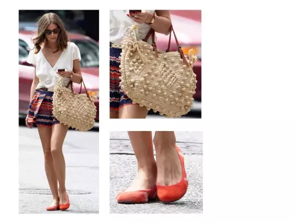 Jaro končí a před námi se otevírá letní sezona. Olivie ji v horkem rozpulzovaných ulicích New Yorku zahájila jaksepatří. Dlouhé nohy nechala vyniknout v krátké rozevláté sukni a barevné proužky podpořila pohodlnými oranžovými balerínkami. Zářivé tóny doplnila smetanovou zavinovací halenkou. Letní šmrnc ale dodala především pletená rákosová kabelka, která je v létě vždycky in. Ve městě i na pláži.
