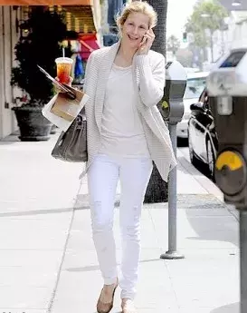 Na pochůzky po Beverly Hills zvolila jednoduchý model složený ze sněhobílých skinny džín, krémového nátělníku a dlouhého rozepínacího kardiganu.