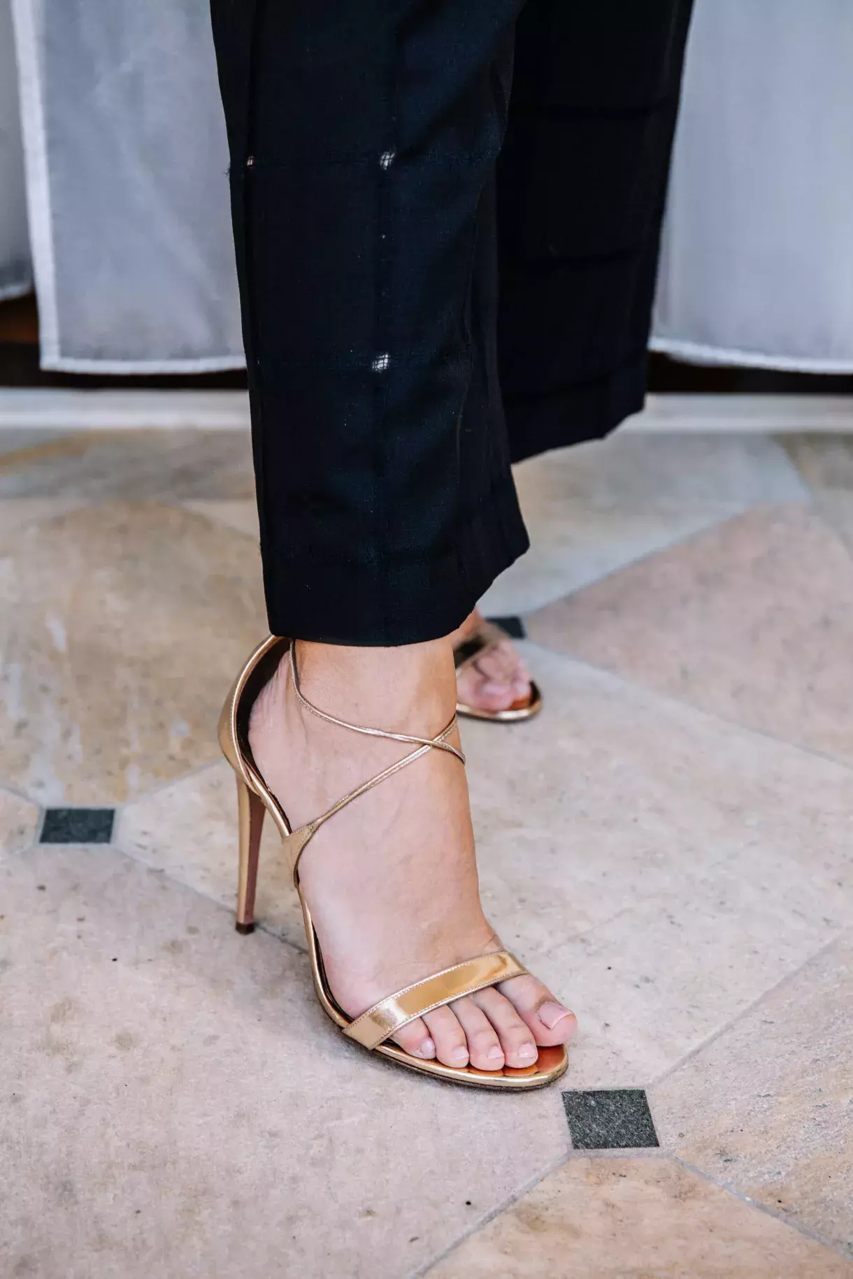 Zlaté sandálky dodaly outfitu ten správný šmrnc.