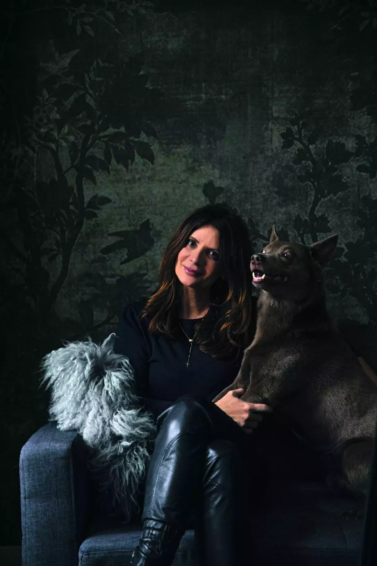 Místnosti dominují rostliny a ptáci na tapetě Midsummer Night od Wall & Deco, dodané na míru firmou Color Design. Stolek ve stylu 50. let je z Ikea. Osvětlení v kovové polici vyrobené na zakázku nechává vyniknout drobným artefaktům a vylepšuje atmosféru. Pes Kalíšek, rasa australská kelpie, v oblíbené poloze na pohovce.