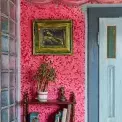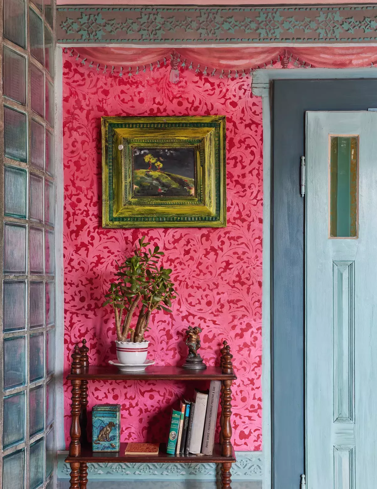 Červená výmalba v ložnici je složena z několika odstínů nanášených přes sebe, aby dodaly stěnám živost. Postel s kovovým rámem dostala zlatavou patinu, noční stolek ze 40. let oživila Vanda modrými odstíny, také ve více vrstvách a s viditelnými tahy štětce, aby působil jako namalovaný na obraze.