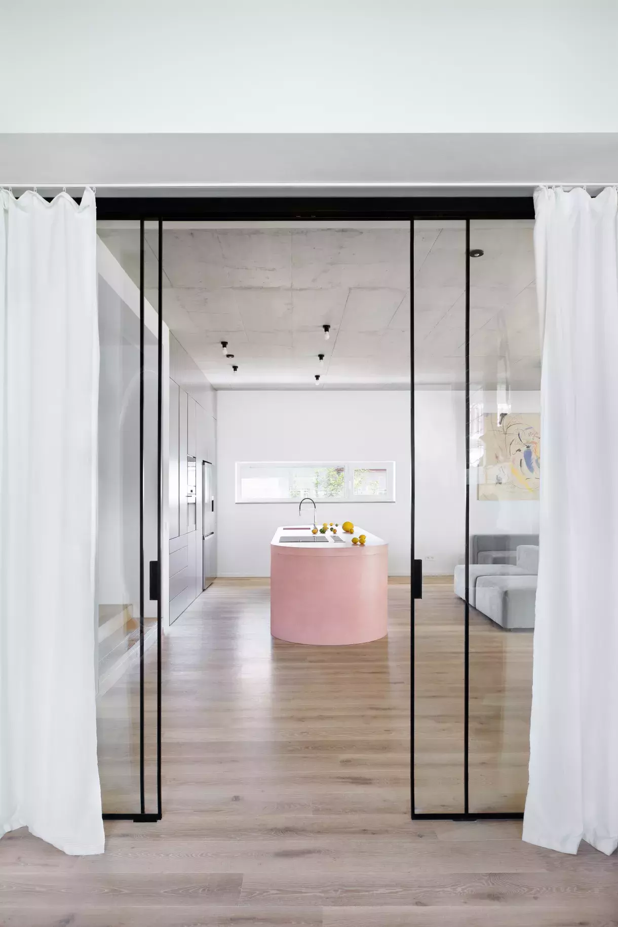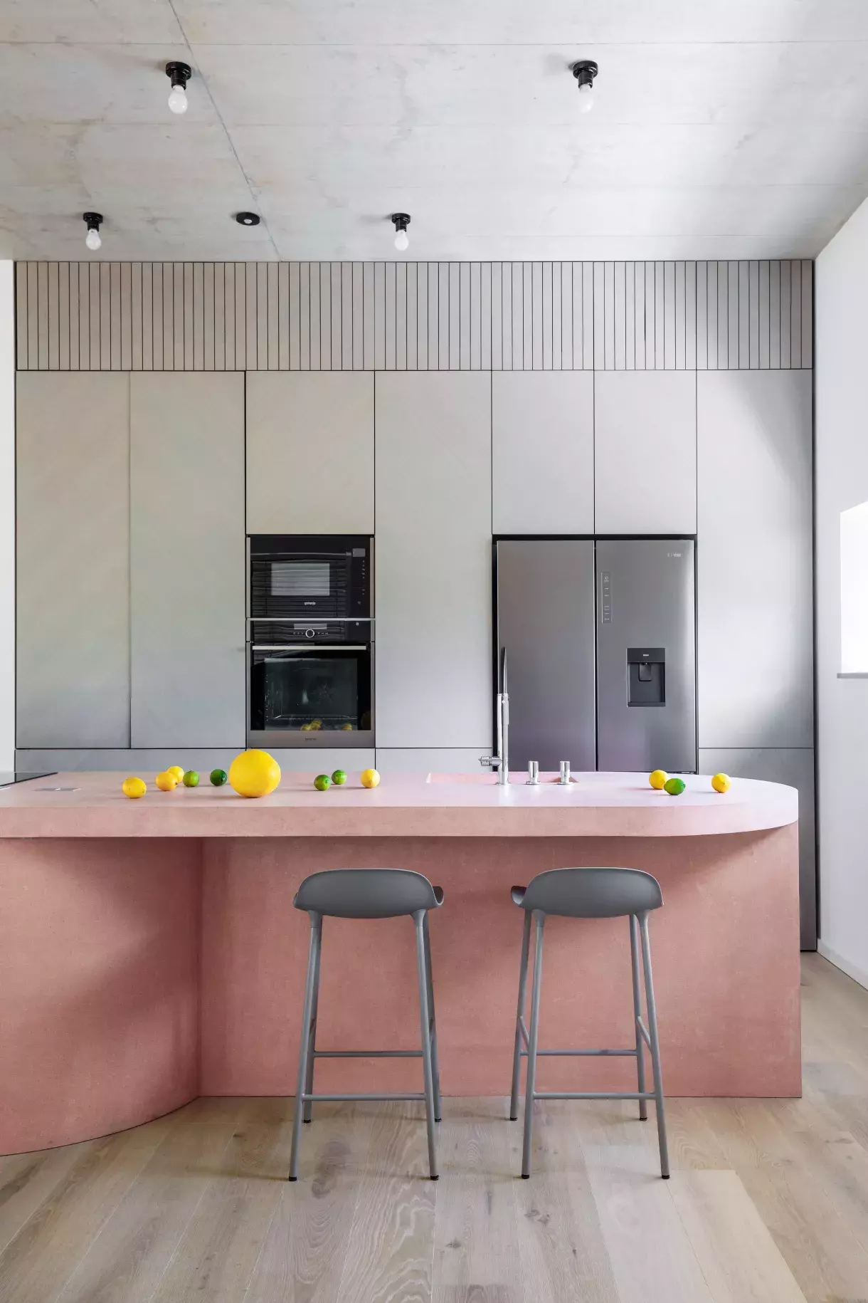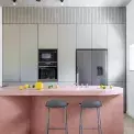 Na instalaci růžového betonového ostrůvku kralujícího (nejen) kuchyni se Martina těšila ze všeho nejvíce. „Když byl konečně na místě a všechny části na sebe sedly, docela jsme si oddychli,“ říká. „Přece jen váží asi čtyři sta kilo a dopravit ho do interiéru vcelku a umístit ho tak, aby vše sedělo podle zadání, byly trochu nervy.“