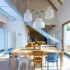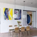 Třebaže se při realizaci interiéru často nabízejí cenově příznivější alternativy, je dobré dát na zkušeného architekta. V případě spolupráce majitelů s Martinou Šandovou to byla například umělecká díla od Michaely Červené, Richarda Konvičky (zde na fotografii jídelny) nebo Davida Krňanského.