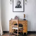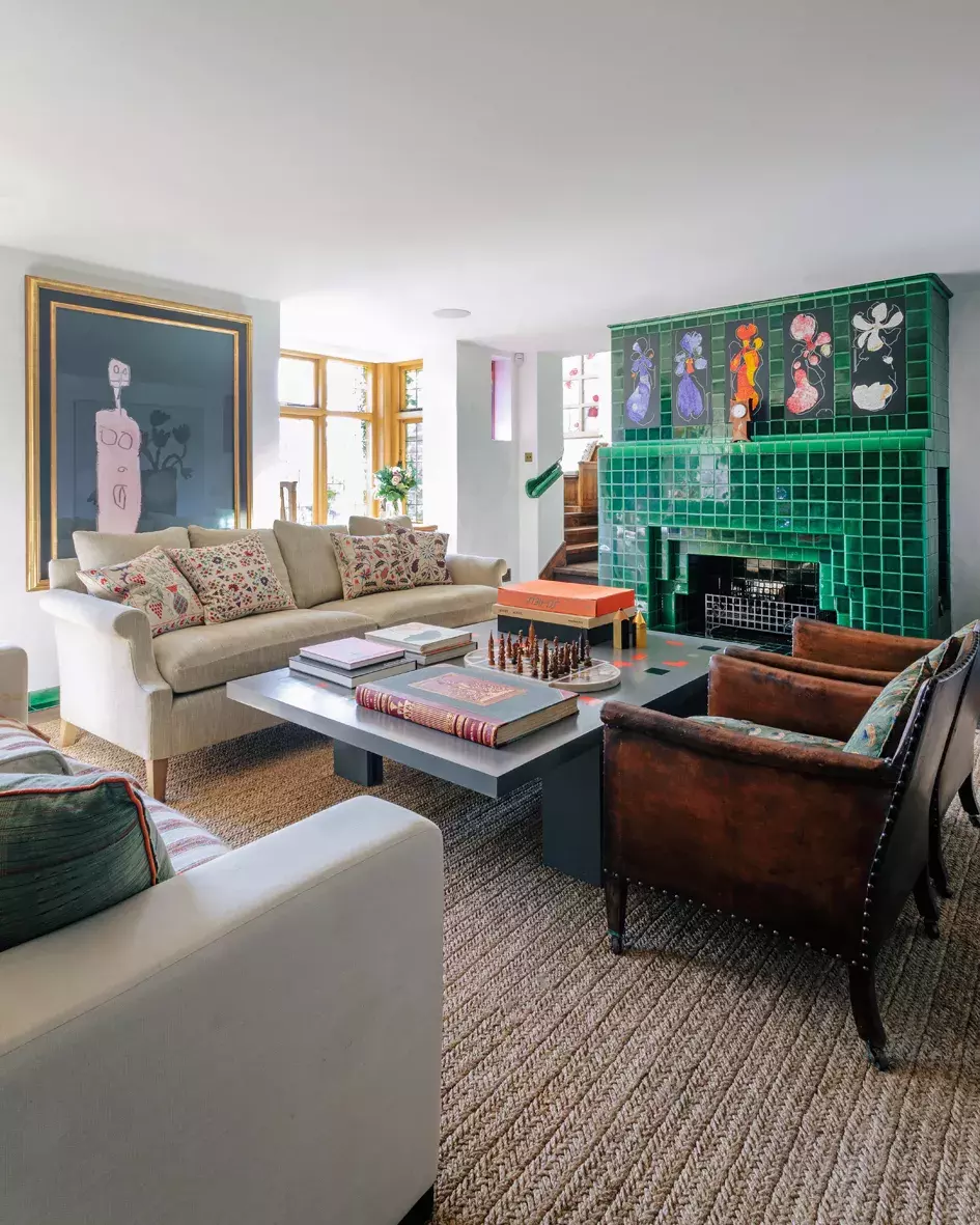 Banksyho malbu na dřevě si nechali manželé Loweovi neobvykle zarámovat jako plátno. V obývacím pokoji visí spolu s díly od Francise Bacona nebo Eduarda Paolozziho. Barevný interiér citlivě doplňuje neutrální sofa, na míru vyrobené v Anglii.