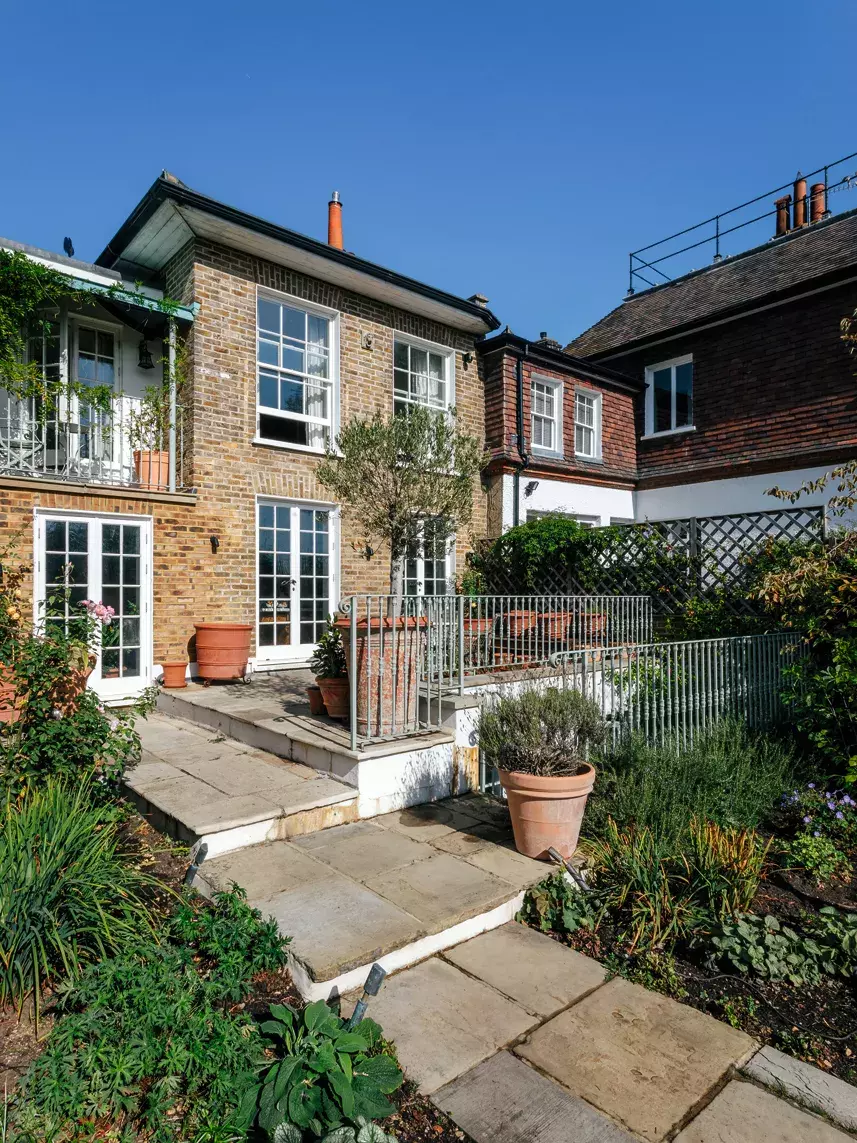 Trojdům obklopuje promyšlená anglická zahrada ve stylu britské pionýrky zahradní architektury Gertrude Jekyll. Vstoupit do ní lze z obýváku i jídelny a majestátní výhled na Temži se otvírá nejen ze zahrady, ale i z terasy u koupelny.
