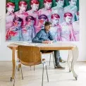 Nad pracovním stolem se nachází dílo od Romana Týce, jednoho ze zakládajících členů skupiny Ztohoven. Vedle stolu je legendární červená laminátová židle ze 60. let minulého století z tramvaje T3 od Miroslava Navrátila. Na stole vidíme první sériově vyráběnou masku s ná-zvem Schizofrenie od Jiřího Černického, která byla ještě nedávno vystavena ve Veletržním paláci.