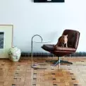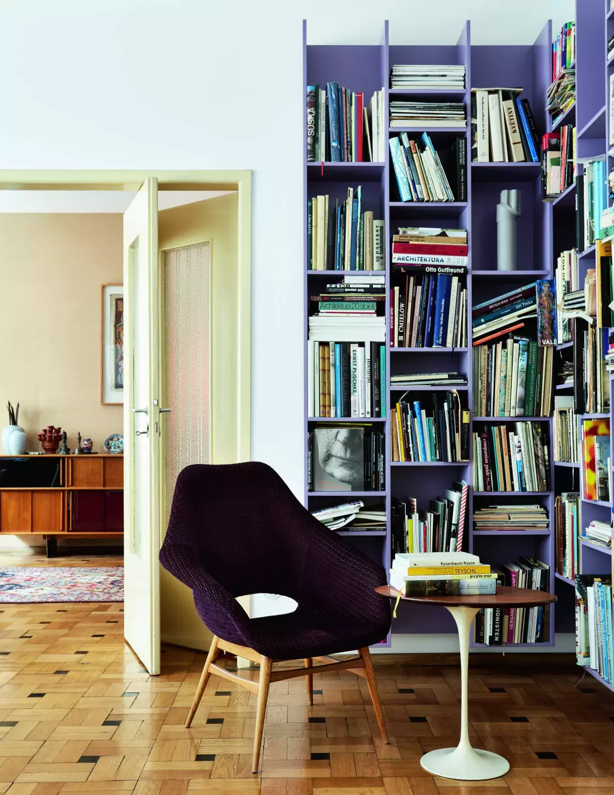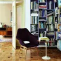 Parkety v celém bytě byly natolik zachovalé, že je stačilo pouze zbrousit a nalakovat. Knihovnu bydlení na míru navrhl architekt David Kazický z ateliéru RicharDavidArchitekti. Ukrývá publikace o umění, designu, architektuře, filmu, loutkářství nebo cestování. Malý stoleček je opět ze série Tulip od Eera Saarinena a skořepinové křeslo je původní design od Miroslava Navrátila z 60. let, jen přečalouněné.