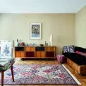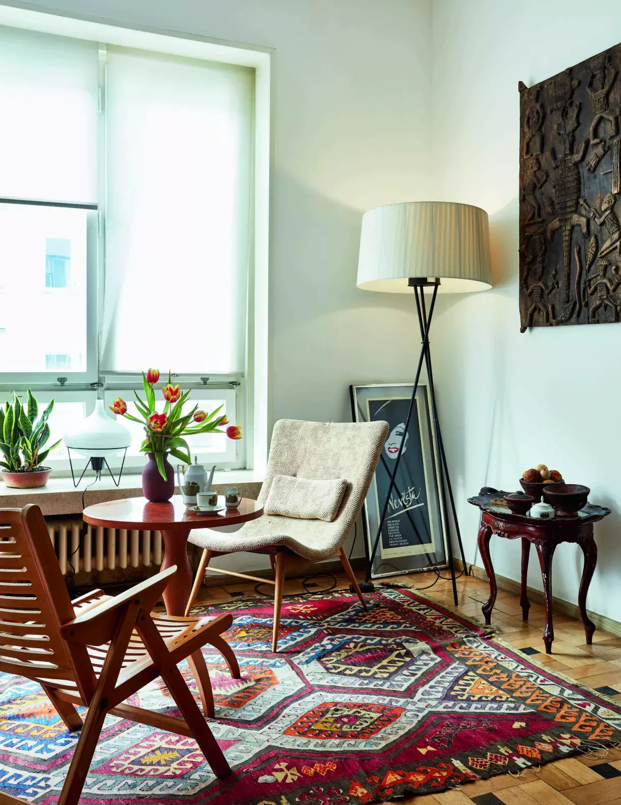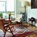 Nomádský koberec kilim je starožitnost dovezená z Istanbulu, u kávového stolku s vázou od Romana Šediny a setem Louise od Jaroslava Ježka se sedí na skořepinovém křesle Miroslava Navrátila nebo ikonické skládací židli Rex od slovinských Rex Kralj. Atmosféru vytváří stojací lampa Tripod španělské firmy Santa & Cole a stolní lampička z antikvariátu. Plakát je od kamaráda z Dominikánské republiky pro jedno z prvních Urošových představení na DAMU. Nad tereziánským retro garni stolečkem z roku 1860 jsou zdobené dřevěné dveře z Nigérie, které zde tradičně vedou do hliněných domků.