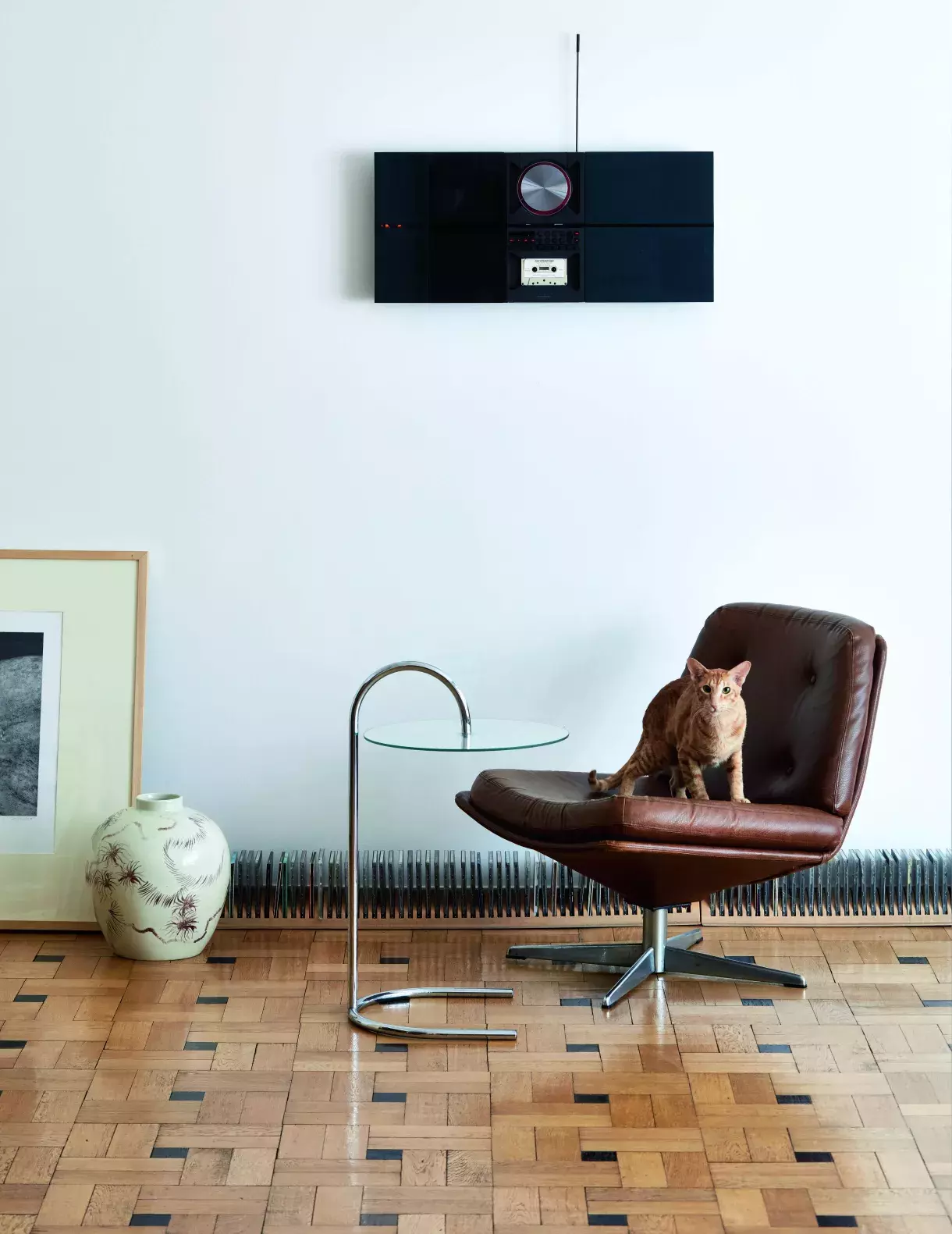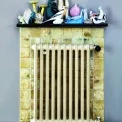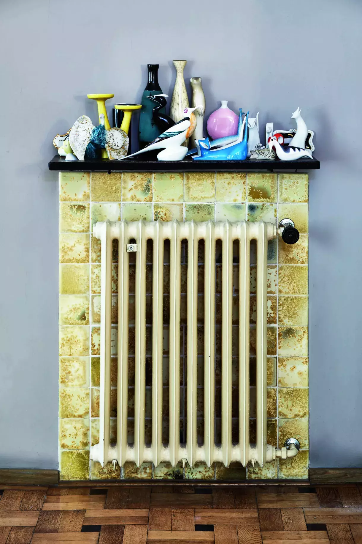 V bytě se zachovala původní topná litinová tělesa s kohoutky a obklady s takzvanými irisovanými kachlíky z katalogu Rako 1935. Speciální technika z obkladů udělala unikátní kusy, které vypadají jako obrazce na zamrzlém okně. Polička je dedikovaná raritám 50. a 60. let. Mimo jiné tam najdeme slavné Ježkovy sošky zvířat, které navrhl pro Royal Dux v Duchcově a za něž posléze mimo jiné získal zlatou medaili na EXPO 58 v Bruselu.