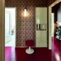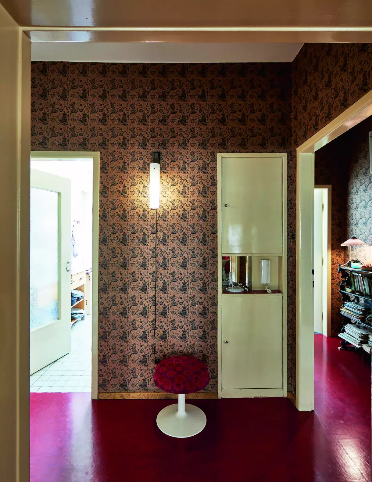 Chodba je ozdobená ručně tištěnými tapetami ze štočků od britské značky Hamilton Weston. Původní chinoiserijní vzor pochází z roku 1690. S podlahou z červeného marmolea ladí přečalouněná vintage stolička, která formálně napodobuje stůl Tulip od Eera Saarinena v jídelně, z níž se na této fotce do vstupní haly díváme. Otevřené dveře nalevo vedou do kuchyně, vpravo se dostanete do ložnice a koupelny. Zabudovaná skříňka ukrývá porcelánovou sošku Surikaty od Antonína Tomáška.