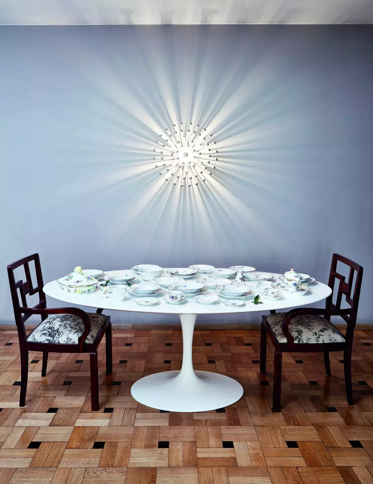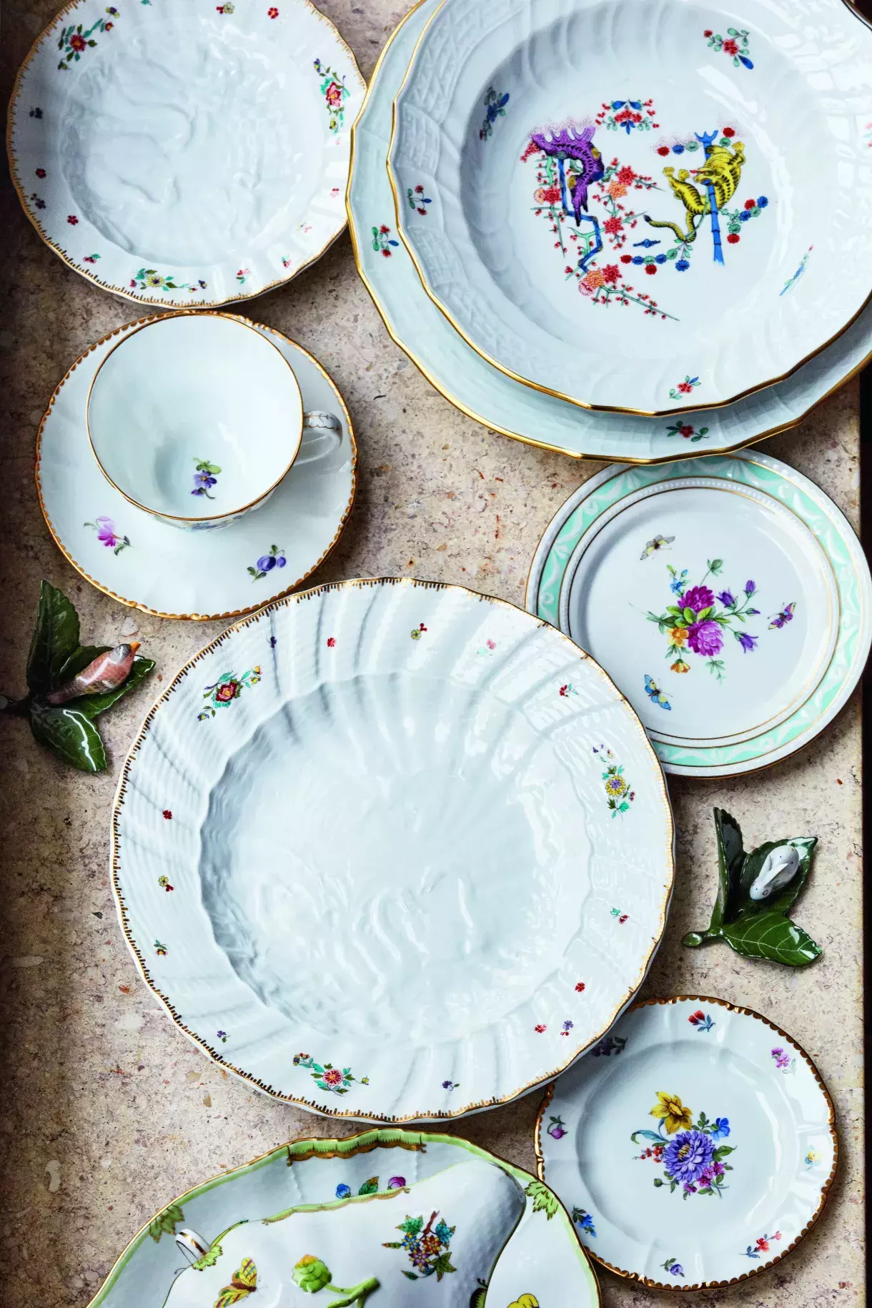 Dechberoucí detaily umí dodnes vyrobit jedna z mála evropských porcelánek, a to rovnou ta nejstarší – Míšeň. Uroš si každý kus vybral osobně z katalogu a nechal vyrobit na zakázku. Každý má jiné zdobení, takzvaný cirát, vzájemně se ale musí respektovat a ladit, aby vytvořily zajímavě komponovaný set. Labutě jsou například cirát používaný Míšní už tři sta let.
