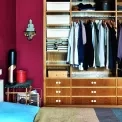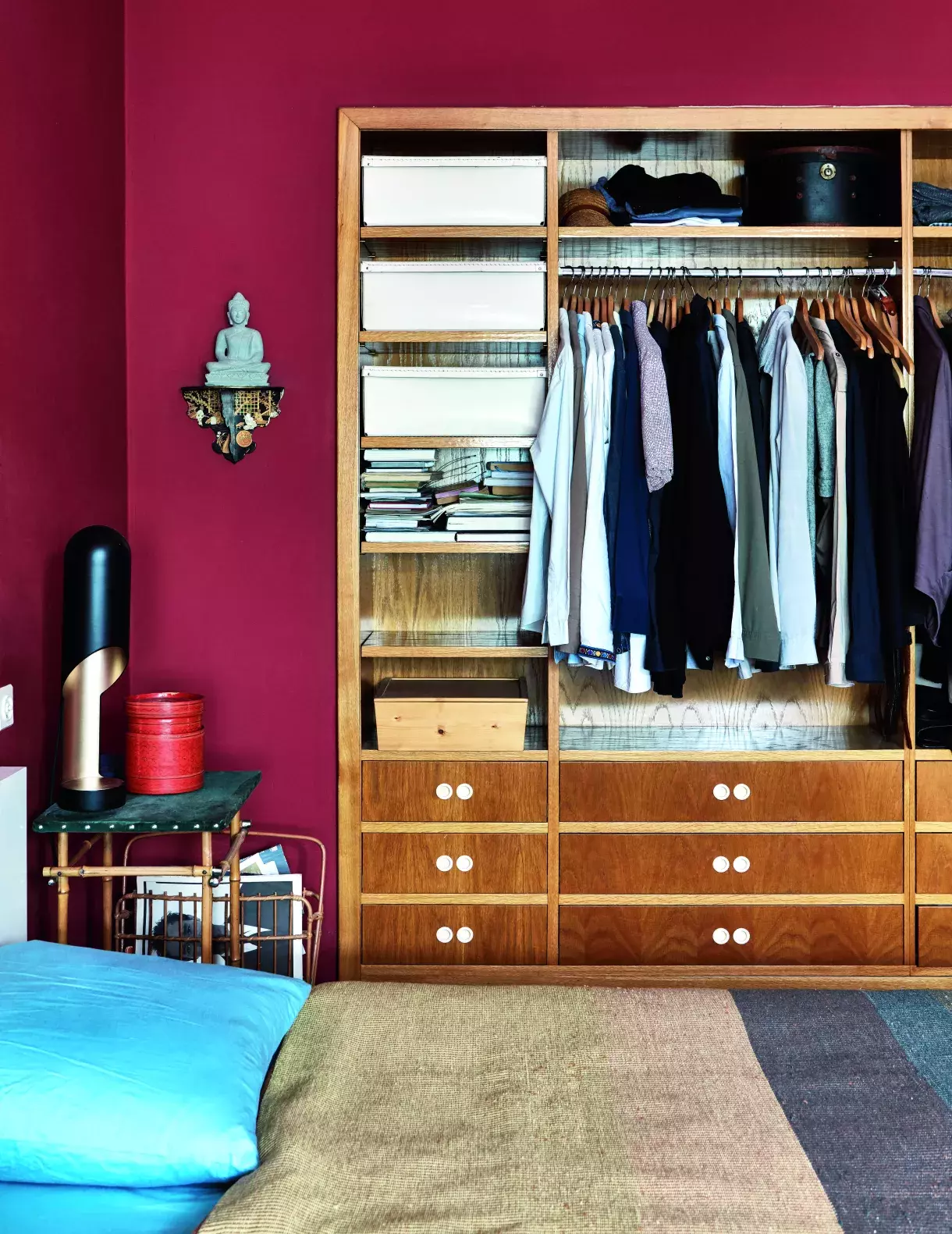 Citlivým dodatkem k původnímu vybavení je vestavěná dřevěná šatní skříň, kterou si Uroš s Martinem nechali vyrobit na míru. U postele svítí na čtení před spaním lampička Pendant Pipe od britského designéra Toma Dixona. Vztah k asijské tematice je patrný na bambusové podnoži nočního stolku a stojanu na noviny, zdobených úložných boxech či sošce Buddhy na zdi dovezené z Kambodži.