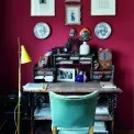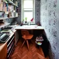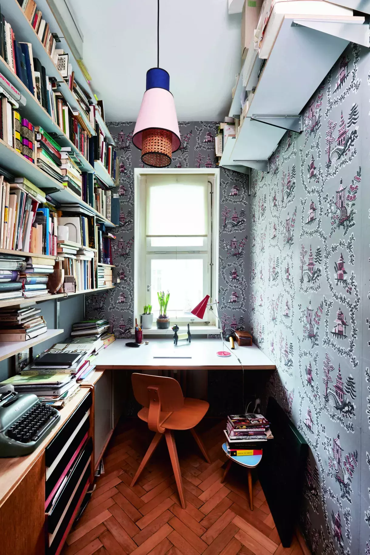 Bývalý pokojík služky dnes slouží jako Martinova pracovna. Zdobí ji ručně tištěné tapety anglické firmy Hamilton Weston s chinoiserijním vzorem, které najdeme také ve vstupní chodbě. Knihovnu na míru navrhl architekt David Kazický, svítidlo jeSingapour od francouzských Market Set, židle Mosquito od slovinského výrobce nábytku Rex Kralj a vintage komoda U-458 od Jiřího Jiroutka ze slavné bruselské série Universal z roku 1958 pro československý národní podnik Interiér Praha. Na stole si hoví kočka Libuše Niklové pod lampičkou od Josefa Hůrky pro Lidokov, oblíbené místo k odpočinku to je i pro kocourka Tinečka.