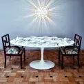 Jídelna je typickou místností pro elektrické domy, kde se výdobytky elektřiny předváděly vybrané návštěvě. Majitelé tam záměrně umístili speciální lampu Pistillo od Studia Tetrarch pro italskou značku Valenti ze 60. let, která historickou efektnost prostor připomíná. Prostírá se na stole z kolekce Tulip od Eera Saarinena z let 1955–1956 pro Knoll a sedí na starožitných židlích po Martinových prarodičích.