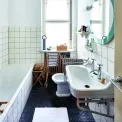 V koupelně jsou původní dlaždičky RAKO, které si majitelé při rekonstrukci poctivě očíslovali, aby je vrátili na původní místo. Z vybavení je originální porcelánové umyvadlo, poličky a zrcadlo, zbytek je novodobý. Turecké ručníky jsou od Zig Zag Zurich, přenosné rádio Bang & Olufsen. Okna jsou původní s originálními kličkami a systémem otevírání.