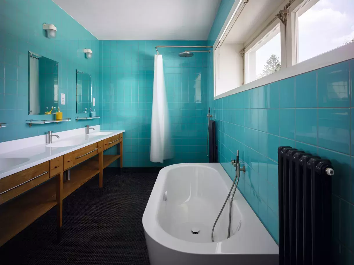 Některé prvky v interiéru jsou až překvapivě současné, jako například baterie v modré koupelně. Barevnost vychází z původních obkladů. Stěny jsou obložené Rako Color One, podlaha kamennou mozaikou Butterfly Devon.