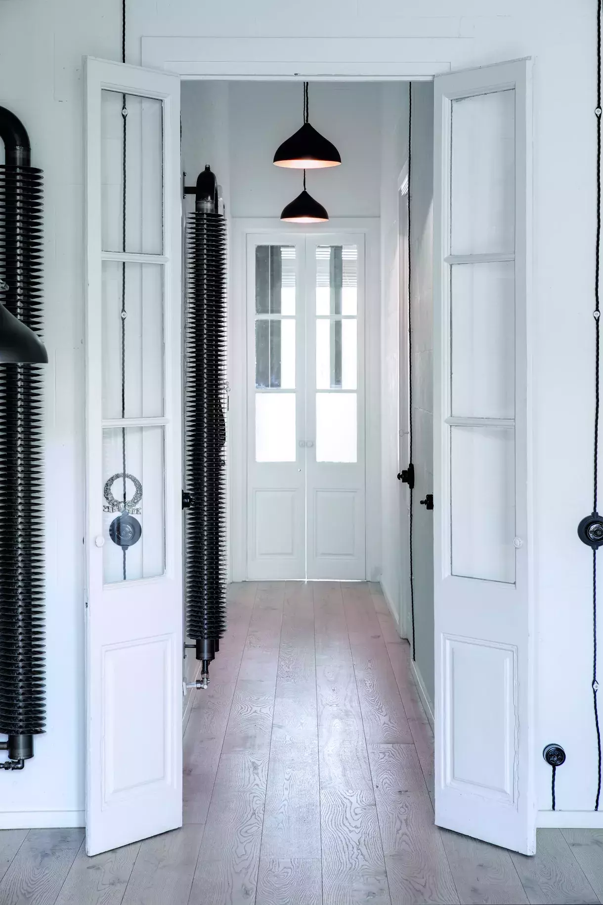 Paleta, ze které je celý byt vystavěn, je ve většině pokojů radikálním způsobem omezená na bílou a černou v kombinaci s dřevěnou podlahou (nebo betonovou stěrkou). Ať už jde o úložný systém Stavebnice 01 navržený designéry, nebo doplňky a osvětlení od severských značek, skandinávský duch, kterým zdejší prostory shodně dýchají, osvěžujícím způsobem narušuje katalánskou pestrost a nabízí pohled odjinud.