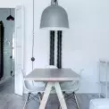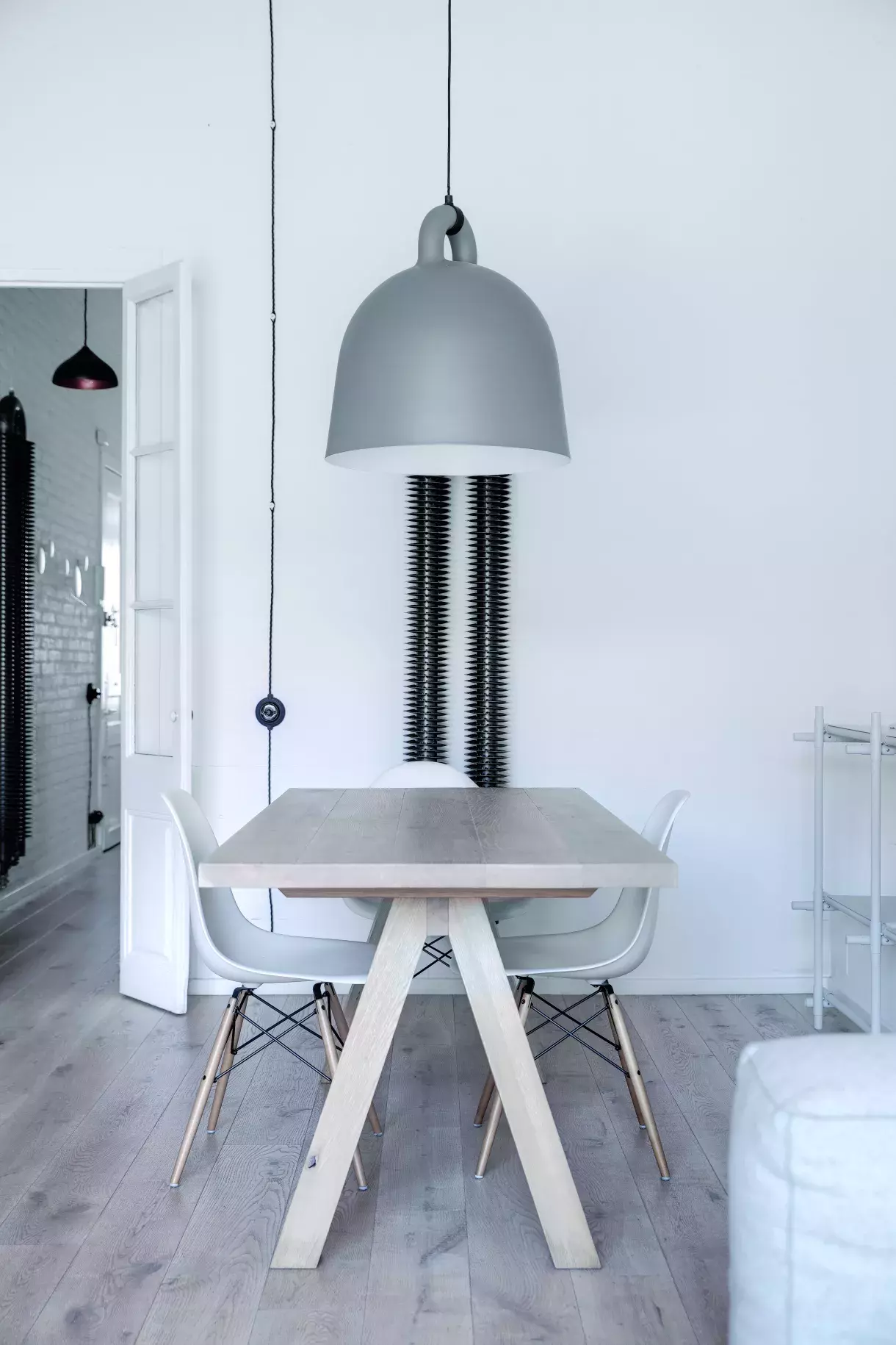 Jídelní stůl nechali designéři vyrobit na míru. Nad něj zavěsili dominantní svítidlo Bell od značky Normann Copenhagen, které je mírně utlumené šedým odstínem. I sem zvolili k sezení model DSW od Vitry. Bílé židličky vytvářejí mírnou protiváhu vzletnému minimalismu industriálního topení.