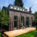 Kuchyni si postavil Jakub s tátou, který je vyučený truhlář. Základ je z Ikea a obložení vyrobili truhláři podle návrhu architektů jako skládačku z překližky. Z levé strany je do boxu zabudovaná koupelná a schody, které vedou do horní ložnice. Vedle koupelny je pak ještě druhá ložnice v přízemí. Vpravo se můžete zachumlot do útulného sezení, která je zasazené přímo do boxu s výhledem na kamna a zahradu.