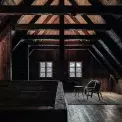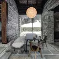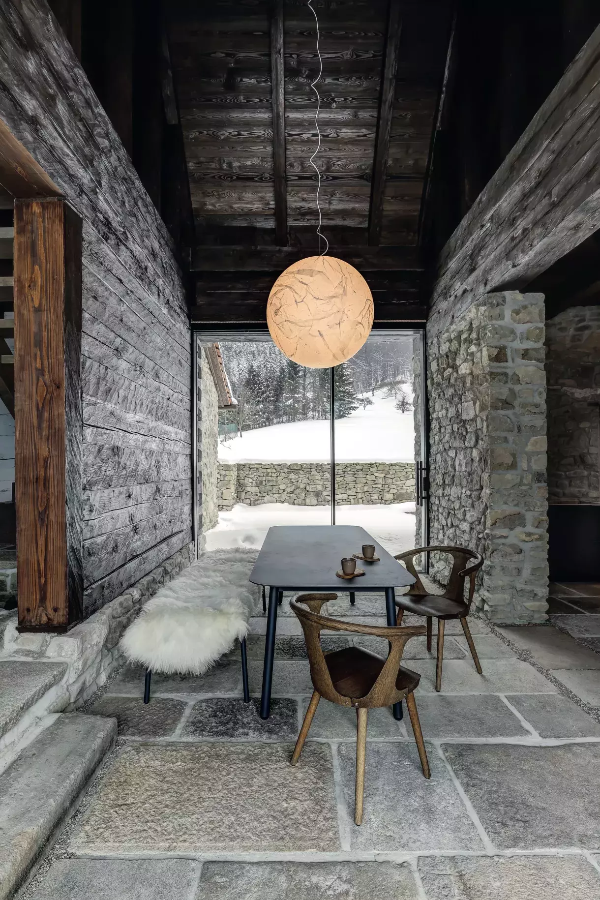 Lustr Moon od italského designéra Davida Groppiho sehrál v celém projektu zásadní roli. Od začátku bylo jasné, že je pro tento prostor jako dělaný. Jídelní stůl, lavice a stolek v kuchyni jsou od přední české firmy Todus. Každý stůl má jinou tloušťku materiálu podle účelu: jídelní čtyři a pracovní v sousední kuchyni dvanáct milimetrů. Oba jsou vyrobené novou technologií tažení keramiky, která se používá především na obklady a dlažbu, protože umožňuje realizaci velkých ploch beze spár. Křesílka jsou z kolekce In Between od &Tradition. Prosklení domu na obě strany vytváří nepřerušený tok pohybu a světla. Interiér zevnitř ven propojují také kamenné bloky na podlaze: v létě se počítá s jejich využitím hned na třech místech – na výhled do údolí je připravena ranní snídaňová terasa, u kamenného štítu nasměrovaného k lesu bude posezení ideální na oběd a na jihozápadě zase do výseku lesa zapadá slunce. V původním průjezdu a kuchyni jsou okna z tenkých hliníkových profilů a v obytné části z modřínu, aby bylo původní rozdělení stále znatelné. Rozmístění oken i dveří je originální, dalo se snadno odečíst ze záseků ve dřevě.