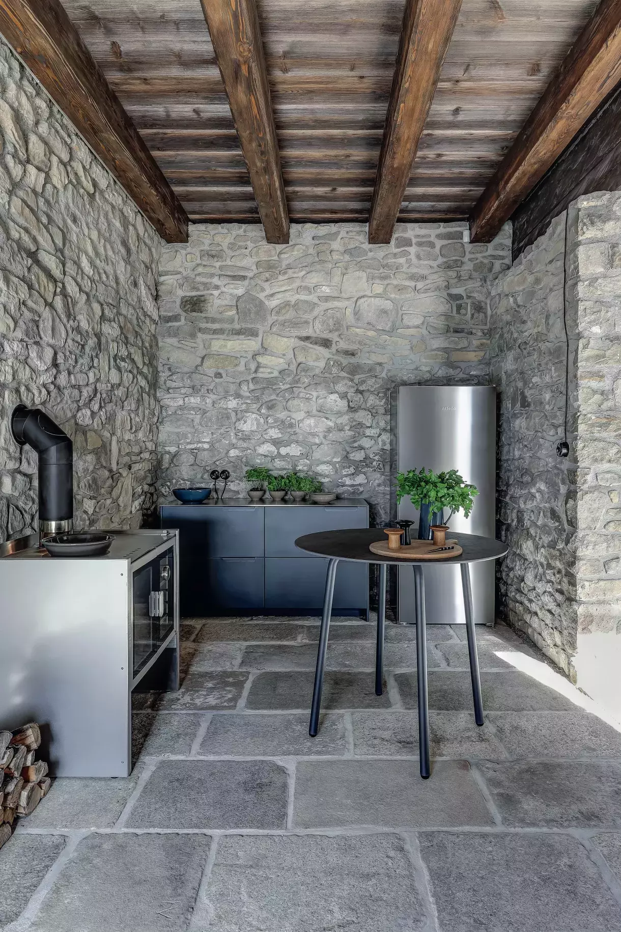 Oheň v domě a studna v zahradě jsou zásadními prvky každého domu manželů Hradilových. Kámen na zdech pochází z okolí nebo přímo z domu: o místní hlíně se říká, že je s příměsí kamene. Kuchyňský stůl je na míru vyrobený od Todus, sporáková kamna na dřevo jsou od Firebelly Stoves ze Spojeného království a kuchyňské skříňky z nové kolekce dánské značky Reform. Rozložení dispozic kopíruje původní systém rozdělení na částí určené k mytí, vaření, přípravě a uskladnění potravin.