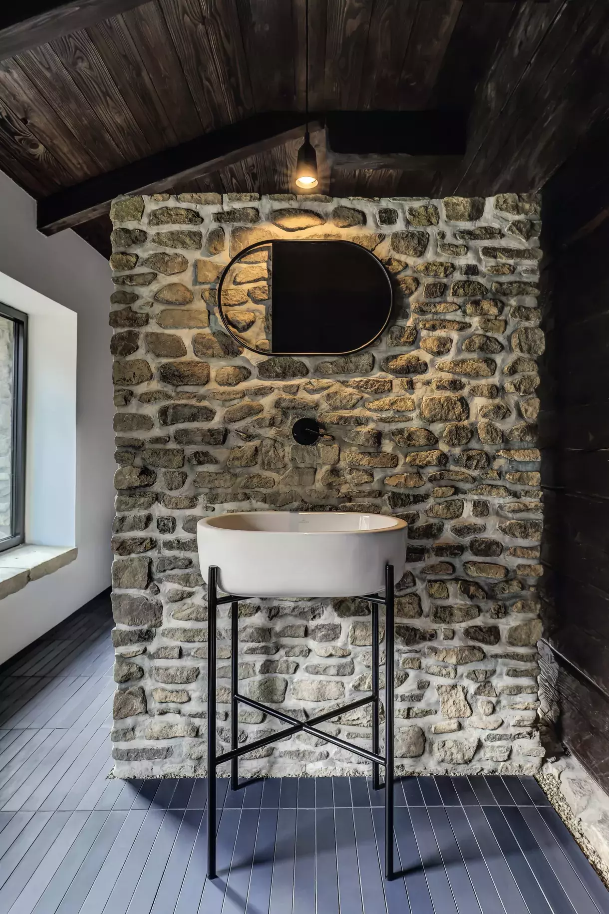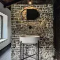 Koupelna se nachází na místě bývalé kůlny. Také proto pro ni Daniela zvolila neobvyklou kombinaci struktur – původní venkovní zeď naznačuje hrubě otesané dřevo, přidanou stěnu obohatil lokální kámen, na podlaze je položená mozaika Mews od studia Barber Osgerby pro Mutina a doplněná kamínky vysypanou drážkou. Za zdí s umyvadlem Villeroy Boch Architectura se skrývá sprchová vana Fonte Fontana od Ceramica Flaminia a hlavice Closer od Zucchetti.