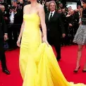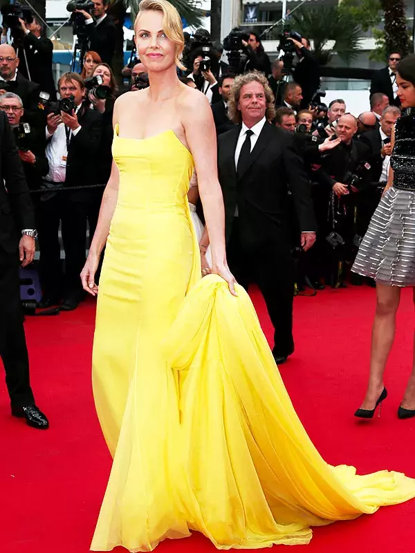 Charlize Theron zazářila na premiéře filmu Šílený Max: Zběsilá cesta ve výrazné žluté róbě Dior a naušnicemi Chopard.