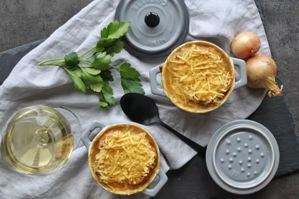 - Rozpalte gril v troubě na maximum. Polévku nalijte do zapékacích misek, nahoru dejte plátky pečiva a zasypte nastrouhaným sýrem. Vložte do trouby a pečte do té chvíle, jakmile se na polévce vytvoří krusta.