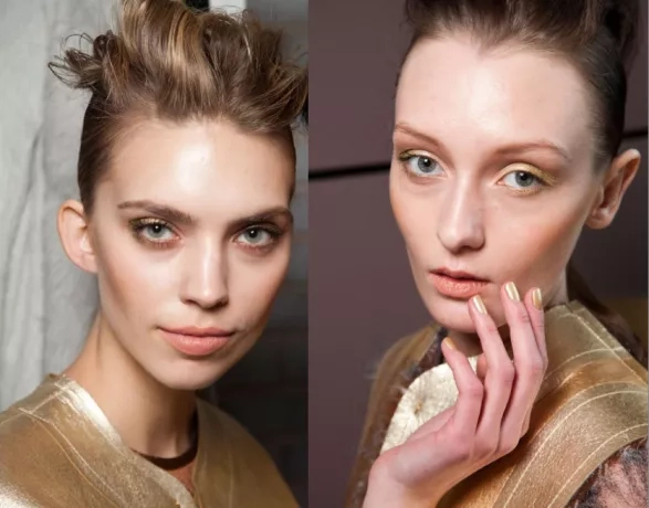 Zlaté stíny musejí být perleťové a s jemnou pigmentací, kdy se stíny nevrství. Naneste je prstem na horní víčko a štětečkem na stíny doplňte podél linie řas. Nedokonalosti jsou tentokrát vítané, tak se nebojte být velkorysejší. Nakonec řasy naličte černou maskarou a pod obočí použijte béžový matný stín.