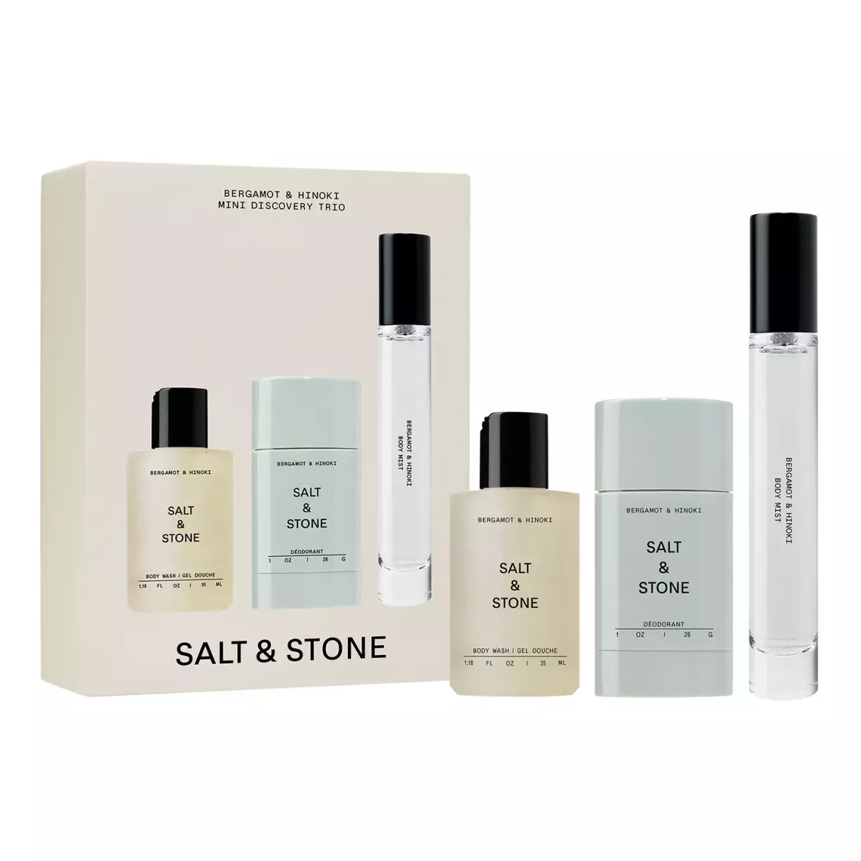 Testovací trio s vůní bergamotu a cypřišku hinoki, Salt and Stone, prodává Sephora, 690 Kč