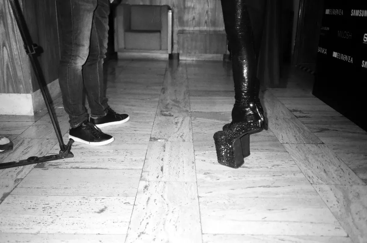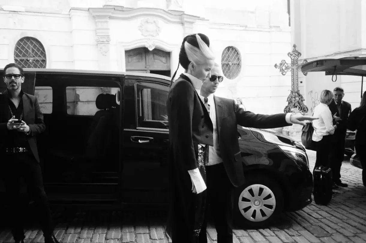 Daphne Guinness dorazila do Galerie Města Bratislavy hodinu před vernisáží. Doprovázel ji hudební producent Malcolm Doherty a producent výstavy Milosh Harajda.