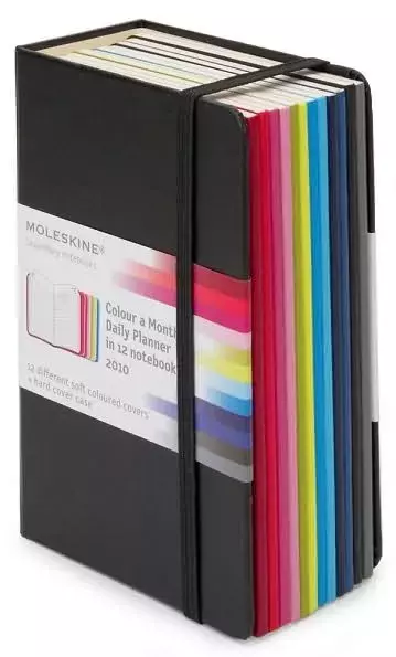 Pokud patříte mezi fanoušky legendárních notesů značky Moleskine, nový diář na rok 2010 vás zaručeně vezme za srdce. Pro každý měsíc je určen zvláštní sešitek v jiné barvě v praktické kapesní velikosti 9 x 14 cm. Všech 12 sešitků je pak uschováno v elegantním černém pouzdře.