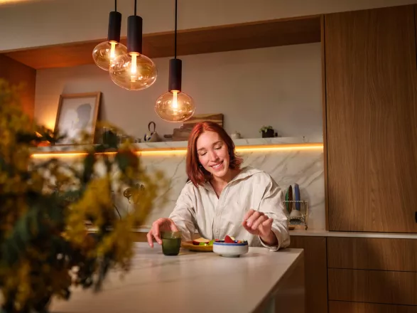 S Philips Hue lze podobné světelné scény připravit předem. Stačí jeden dotyk v aplikaci a světlo se přizpůsobí situaci – ať už jde o večeři, sklenku vína nebo klidný večer s hudbou.