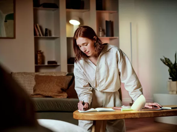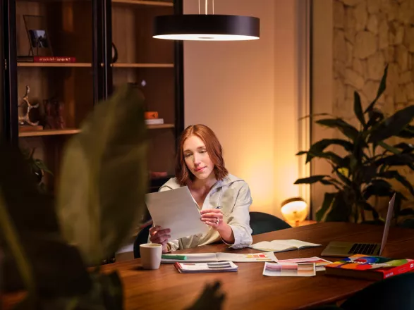 Pokud pracujete z domova, může stejný prostor během pár vteřin přejít do pracovního režimu. Stačí změnit světelnou scénu v aplikaci Hue a světlo se přizpůsobí aktivitě – jasnější a chladnější tón podporuje soustředění při práci u počítače nebo při online meetingu. Váš obývací pokoj se tak na pár hodin promění v malou, ale funkční home office.