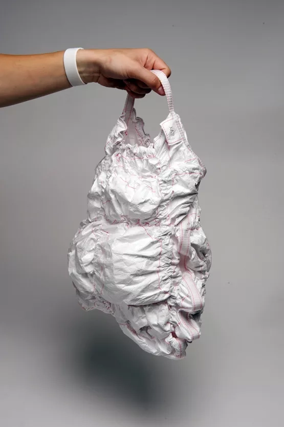 Tyvek si pro svou absolventskou práci vybrala i Ilvy Jacobs, specialistka na experimenty s novými materiály. Tašky jsou neuvěřitelně lehké, ale přesto pevné a odolné. Ilvy se nechala inspirovat hlavně sportovními střihy, takže v kolekci najdete klasickou tenisovou brašnu i tašku na bowling.