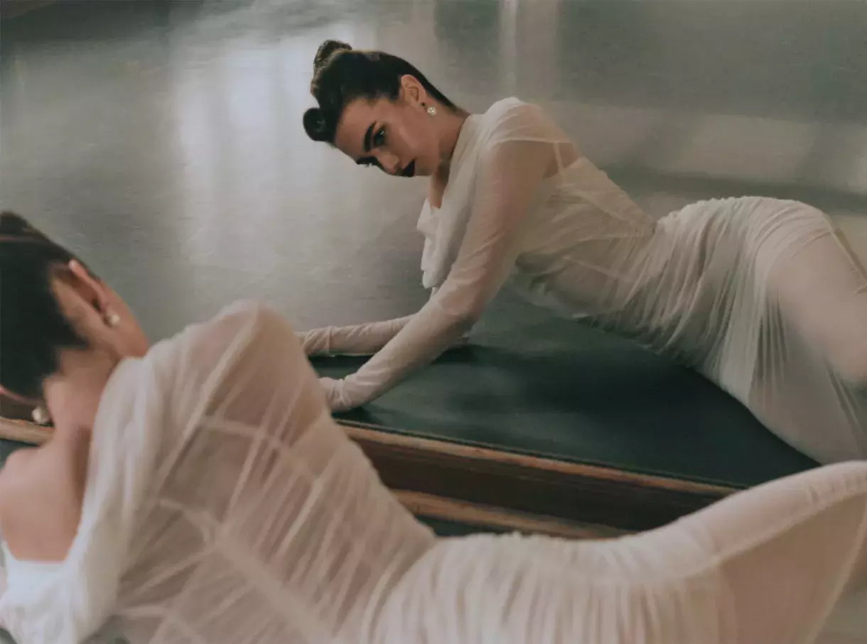 Šaty, Nensi Dojaka; top, Jacquemus; legíny, The Attico; náušnice, Alexander McQueen; boty, baletní.