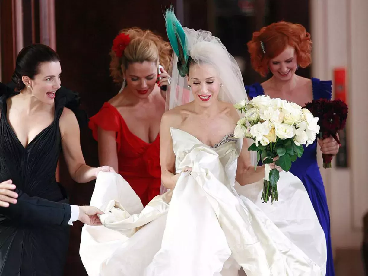 Moderní nevěsta číslo jedna se navždy stane božská Carrie (Sarah Jessica Parker) v šatech od britské módní návrhářky Vivienne Westwood. I přesto, že tato svatba s panem Božským nemá šťastný konec byl to největší tahák celého snímku.