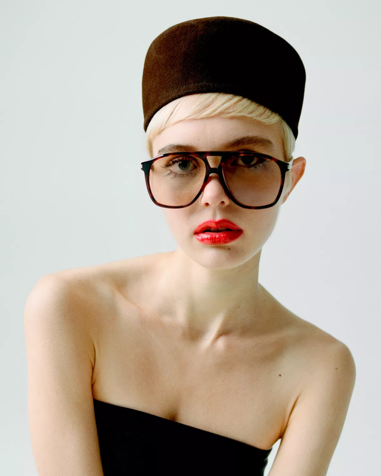 Acetátové brýle, SAINT LAURENT; klobouk, VINTAGE; top, THE ROW.