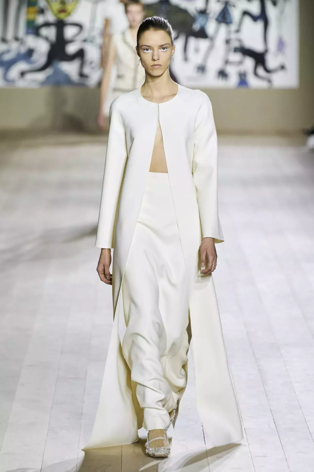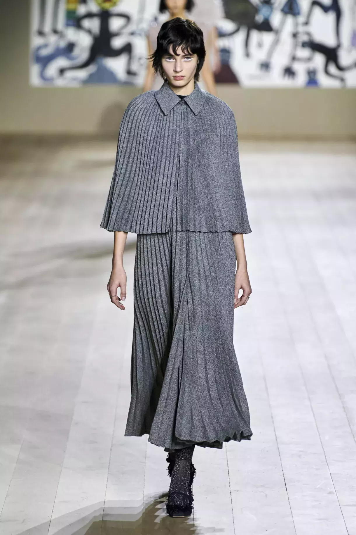 Dior Haute Couture SS 2022 - dlouhé kabáty s retro límci střídaly kápě a peleríny, které tvořily dvoudílný plisé kostým