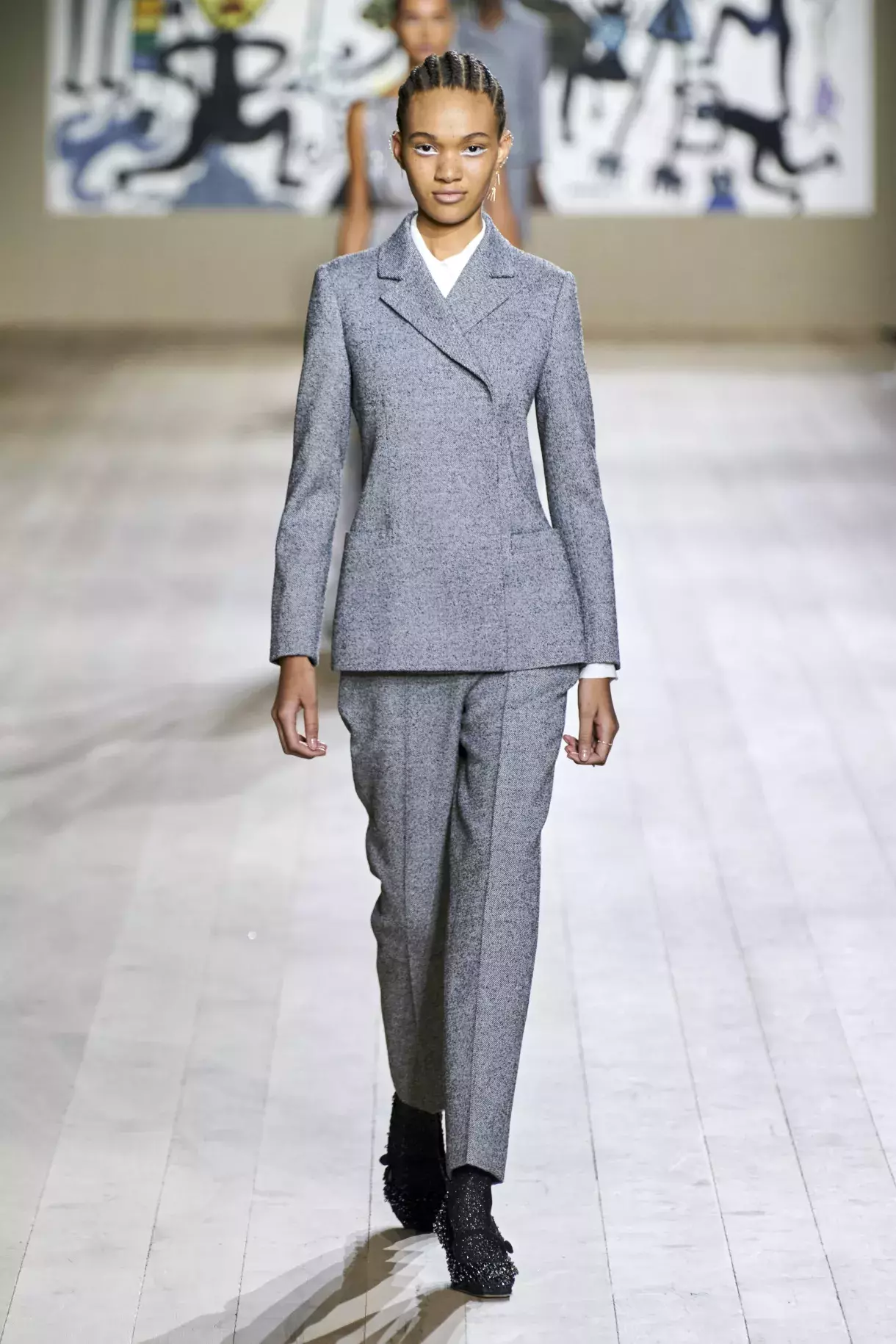 Dior Haute Couture SS 2022 - Maria Grazia Chiuri předvedla i poměrně strohé kostýmy v černé, šedé a bílé vlně s uvolněnější verzí Bar jacket